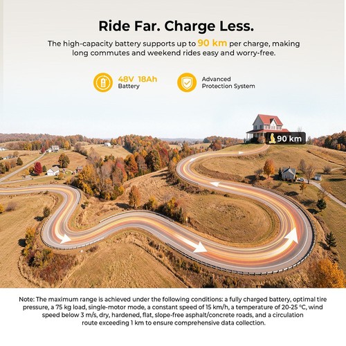 - Range: 90 km on a single 48 V 18 Ah charge