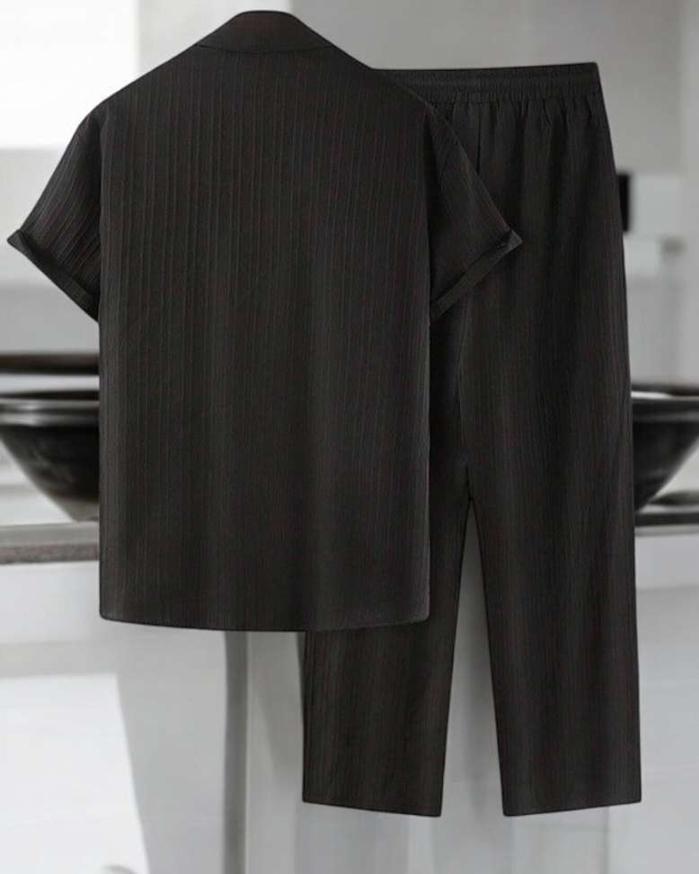 - Style: Classic black striped shirt + solid pant, perfect for casual outings or work‑from‑home