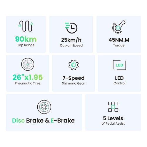| 90 km max range – ideal for daily commutes | Top speed limited to 25 km/h (legal e‑bike limit) |