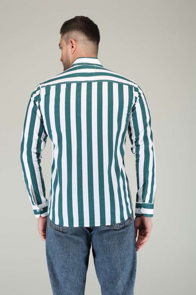 - Design: Modern striped pattern with spread collar – effortless style.